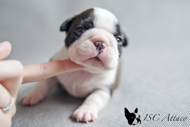 W domu nazywany Kropkiem z powodu dwóch malutkich kropek na pleckach. Cały czas stara się dogonić Attaco z wagą a co za tym idzie... ciągłe dojenie mamuśki. Jak tylko się obudzi to za sekundę jest już przy cycu. Jak mu się coś nie podoba bardzo szybko daję o sobie znać.